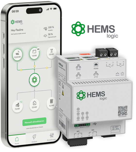 Das Home Energy Management System HEMSlogic von Schneider Electric verbindet die Visualisierung und Steuerung der Energieflüsse mit Effizienz, in dem es die im Haus erzeugte und benötigte Energie automatisiert regelt. HEMSlogic ermöglicht die Optimierung des Eigenverbrauchs und damit Kosteneinsparungen. Das Energiemanagement-Gateway regelt die Integration und automatisierte Steuerung erneuerbarer Energiequellen und schafft somit eine nachhaltigere Energieversorgung. Mit HEMSlogic kann sich das Zuhause Deiner Kunden zum Prosumer Home verwandeln!
