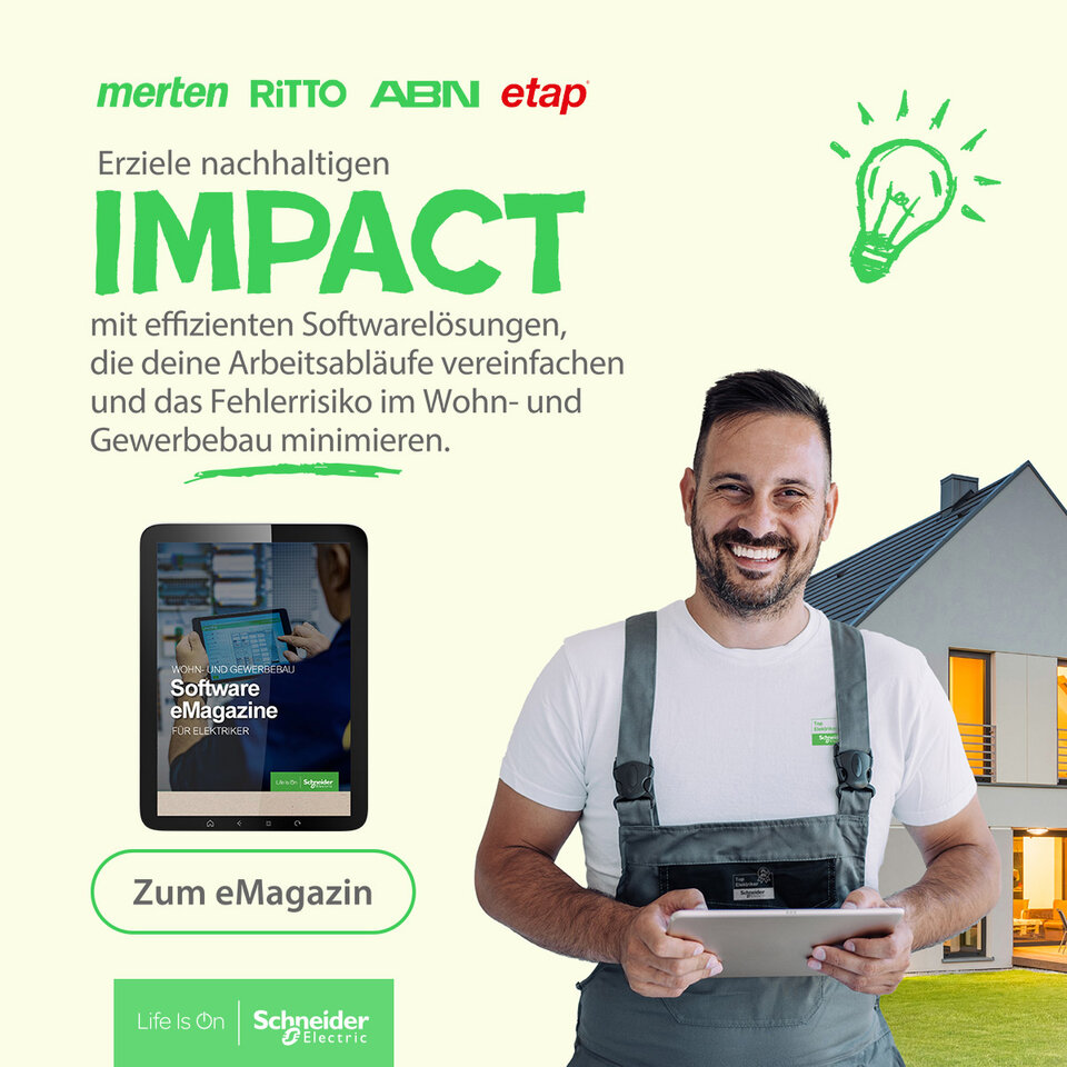 Entdecke in unserem eMagazine die innovativen Softwarelösungen, die Du als Elektriker im Wohn- und Gewerbebau benötigst. Tauche ein in Themen wie nachhaltiges Bauen und die signifikanten Auswirkungen von Building Information Modelling auf den Bauprozess. Erfahre mehr über unsere umfangreiche Palette an Planungs- und Konfigurationssoftware, darunter SEE Electrical Building SE, die Zählerplatz-App, den Merten Label-Manager, eConfigure KNX lite, den Ritto Anlagenkonfigurator, den USV-Selektor und viele weitere Tools. Darüber hinaus bieten wir Einblicke in die digitalen Services von mySchneider und unsere engagierte Partnerschaft mit dem Elektrohandwerk.