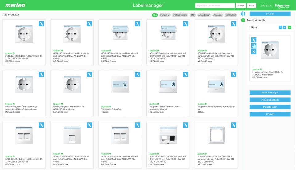Mit dem Labelmanager erfolgt die Kennzeichnung von Schaltern, Steckdosen, Tastsensoren, Raumcontrollern und mehr jetzt online. Über eine intuitive Bedienoberfläche lassen sie sich wunschgemäß mit Symbolen, Text, Logos oder Motiven gestalten.